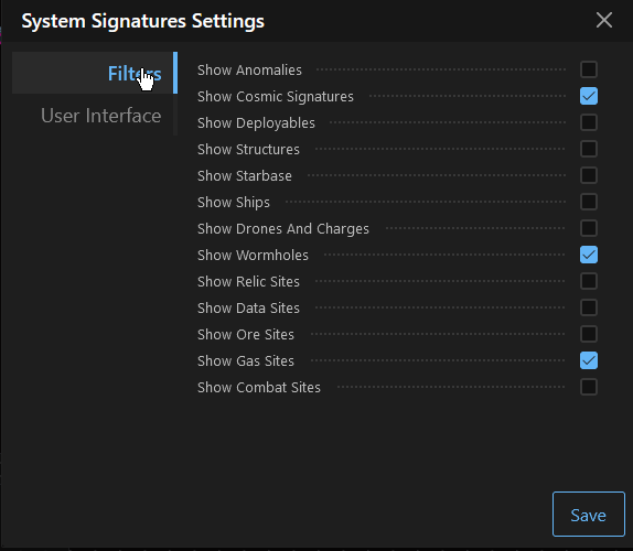 - Under Filters you should have at least the ‘Show Cosmic Signatures’ and ‘Show Wormholes’ checked. All of the others are optional but having too many will make the widget difficult to read.